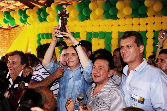 Na fotografia, José Serra em aglomeração de tucanos, mostrando a imagem de São Francisco das Chagas, na cidade de Canindé, norte do Ceará, sábado (16).
